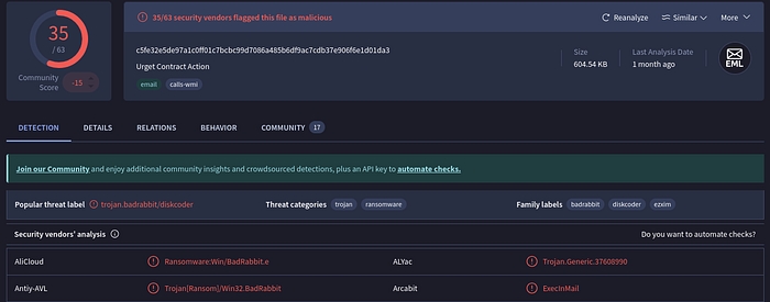 Uploading the file to VirusTotal give me the family name, badrabbit.