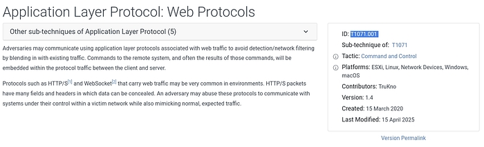 Here I was looking at the Command and Control section of the VirusTotal page. Specifically the application layer protocol and its MITRE ID T1071.