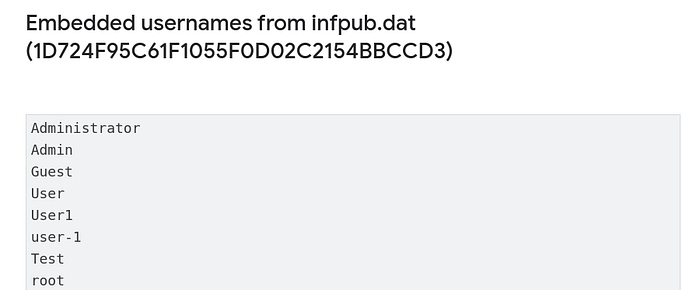 While I don’t have the file on hand, I can do some research online. Looking for other reports that have detailed the malware and the files it has dropped, I find a report by Google. Detailing a list of usernames that are embedded inside infpub.dat.