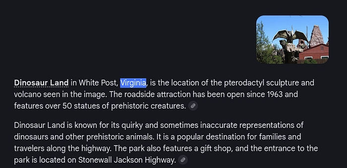 I used Google’s Image search to try and find where the photo was taken. Using their AI it managed to pin point Dinosaur Land in White Post Virginia.